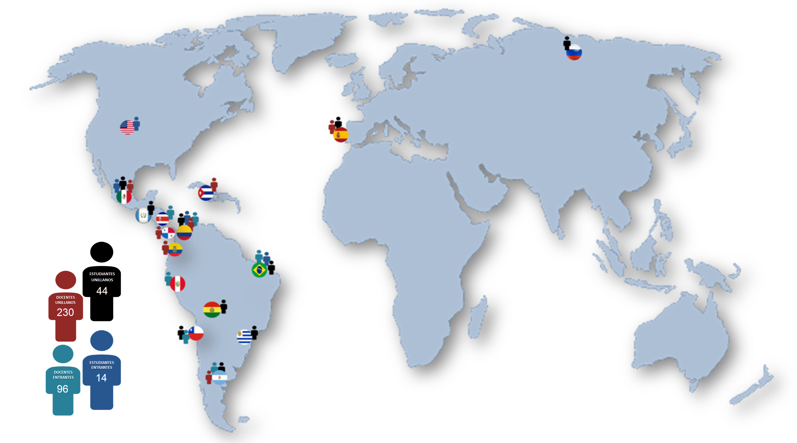 Estudiantes en Movilidad Académica de Doble Vía, de Estancias de Investigación, Ponencias, Asistencia eventos, de los cuales 44 estudiantes de Unillanos y 1 de la IES.