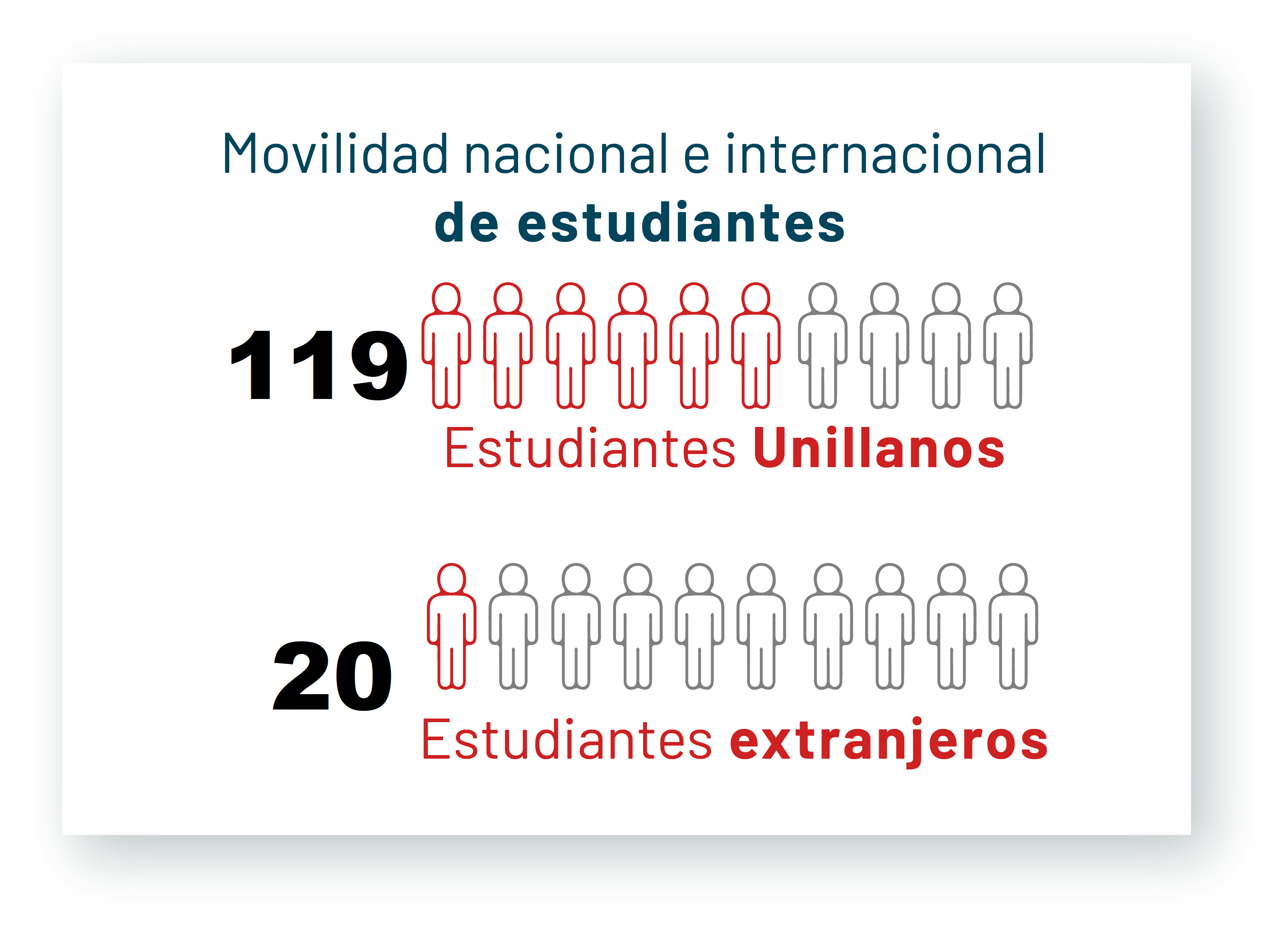 Estudiantes en Movilidad Académica de Doble Vía, de los cuales 24 estudiantes en movilidades de intercambios, prácticas y pasantías, 19 estudiantes de Unillanos y 5 de la IES.